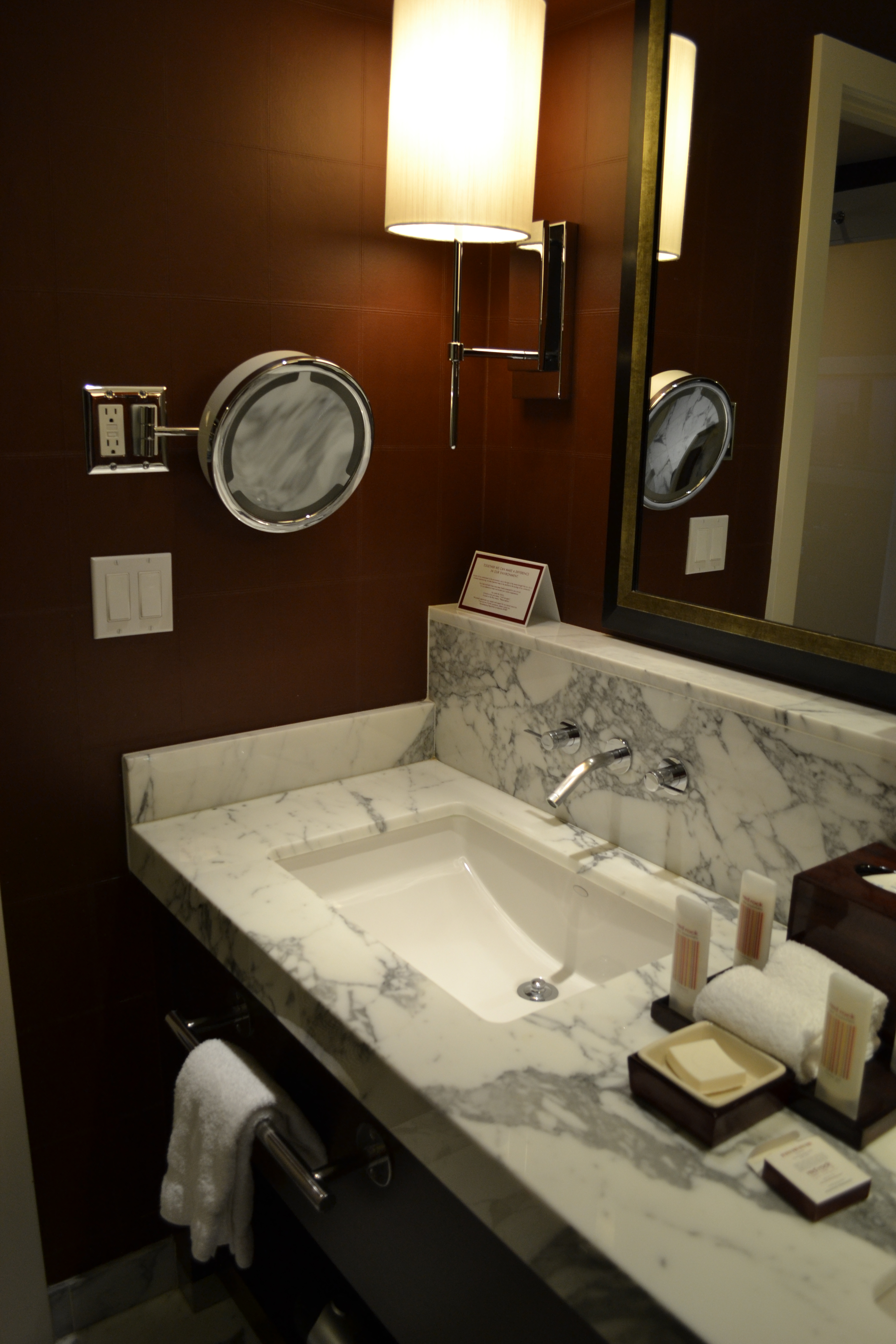 ◱ Double sinks with attractive toiletry display