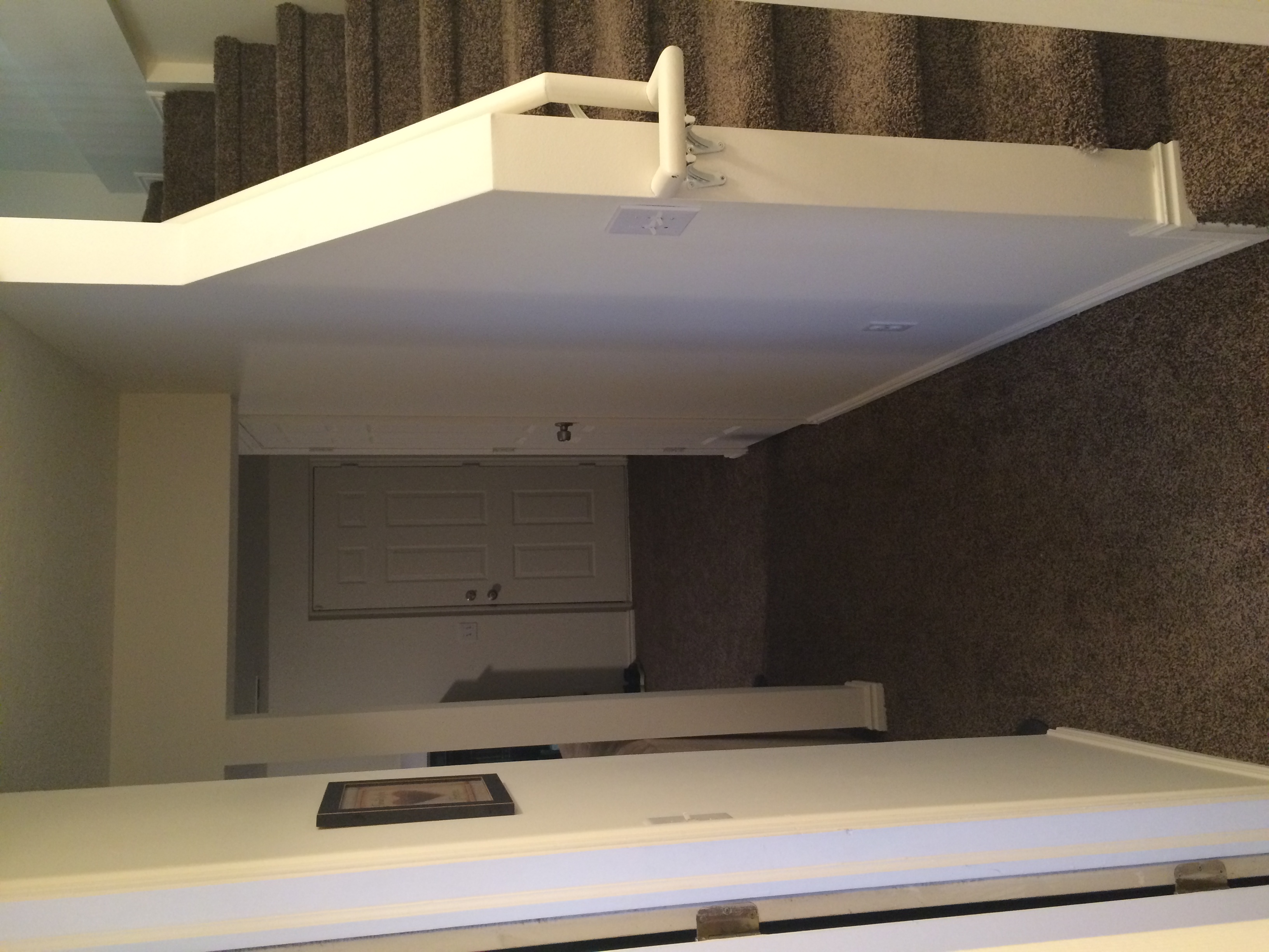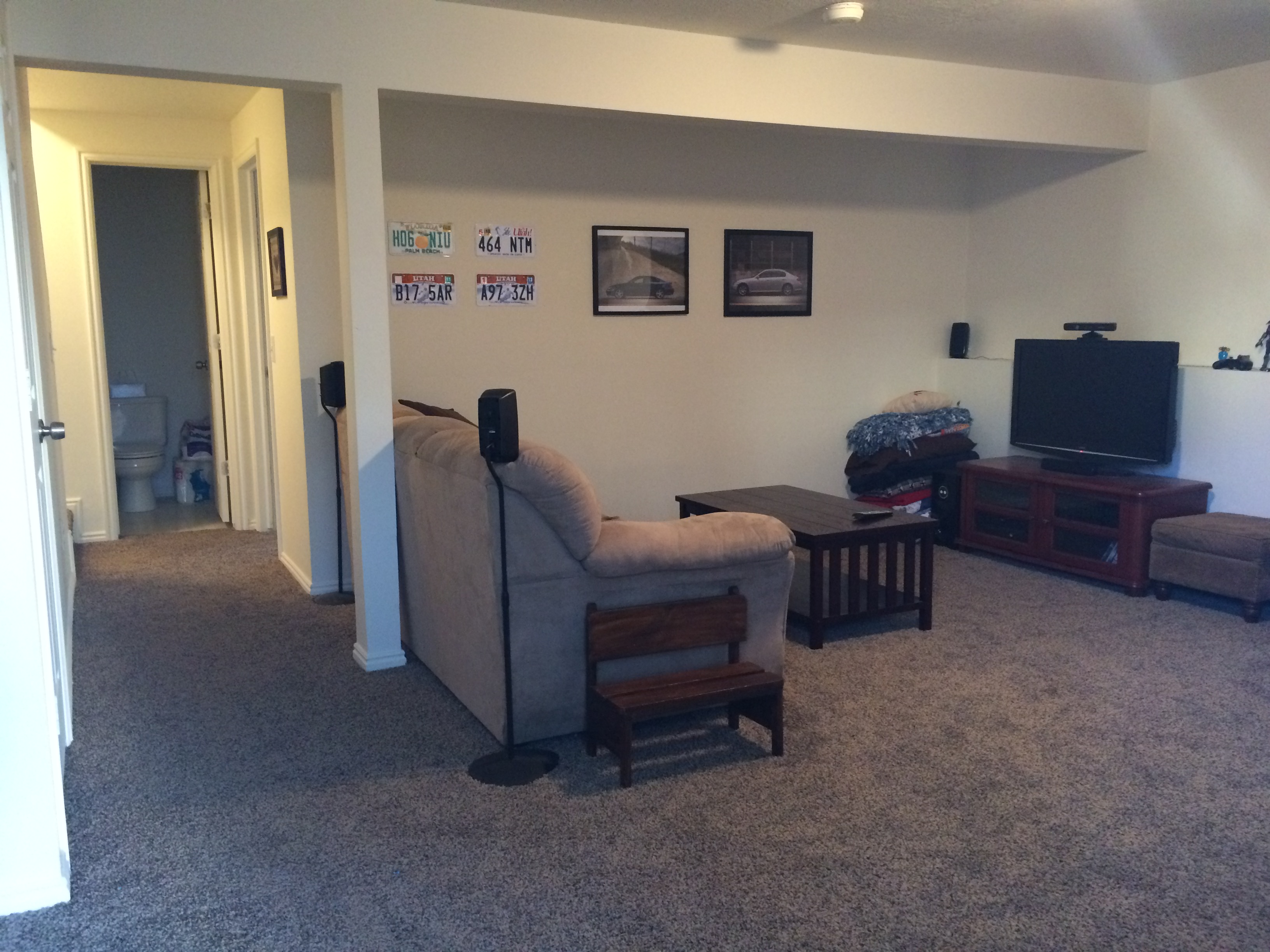 ◱ Standing at basement bathroom looking at basement and stairs. Laundry door on left